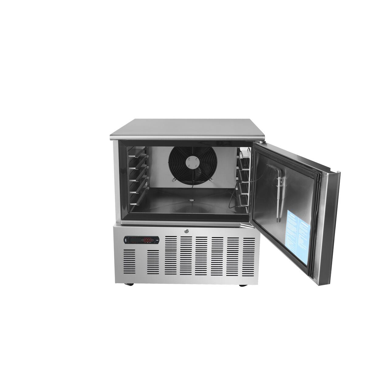 Abatitor, capacitate 5 tavi GN 1/1 - 400×600 (97 Lt), capacitate de a raci 5 kg de alimente de la +90°C la +3°C in doar 90 de minute per tava, poate congela 3 kg de alimente de la +90°C la -18°C in 240 de minute per tava, pastrand gustul, textura si valoarea nutritiva, structura inox, racire ventilata, gaz refrigerant R290 Propan - GWP3, grosimea izolatiei 70 mm, pe roti, greutate 89 kg.