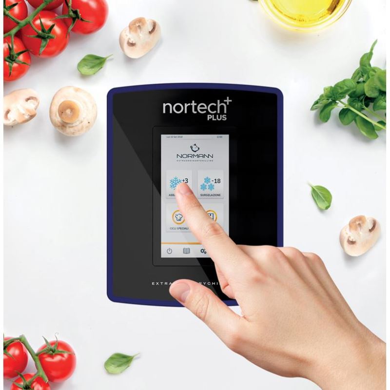 Abatitor/surgelator de temperatura, model Nortech Plus 12F, capacitate 12 tavi GN 2/1 H40 - H65, 24 tavi GN 2/1 H20, 25 grilaje GN 2/1, multiple programe de lucru, maxim 4 sonde de produs cu sistem de prindere de usa, 1 sonda de produs cu 3 puncte de masurare inclusa, display capacitiv 7”, functie de sanitizare a pestelui la -20°C, functie de control a vitezei ventilatorului pentru produsele delicate, dimensiuni interne camera 716 x 548 x 1066h mm, productivitate 78 kg de la +90°C la +3°C; 58 kg de la +90°C la -18°C, structura inox AISI 304, dezghetare automata, control electronic, gaz refrigerant R404A - R452A - R448A, picioare reglabile in inaltime.