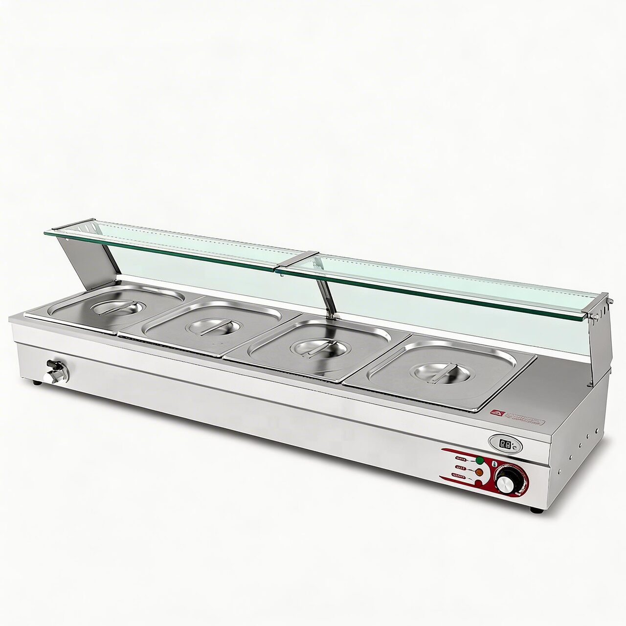 Bain-marie cu 4 cuve, structura inox, cuva potrivita pentru 4 x GN 1/2 x - 100mm, interval de temperatura 30-110℃, afisaj digital al temperaturii, protectie rezistenta la ardere uscata, greutate neta 20kg.