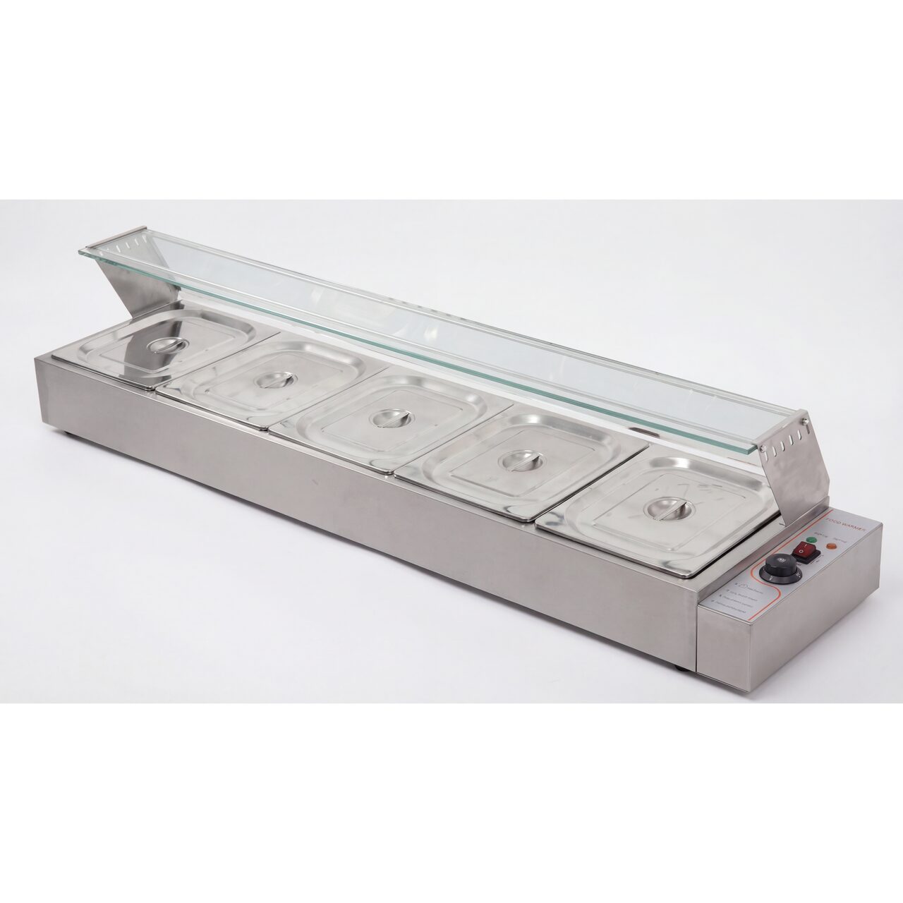 Bain-marie cu 5 cuve, structura inox, cuva potrivita pentru 5 x GN 1/2 x - 100mm, interval de temperatura 30-110℃, protectie rezistenta la ardere uscata, greutate neta 20.5kg.