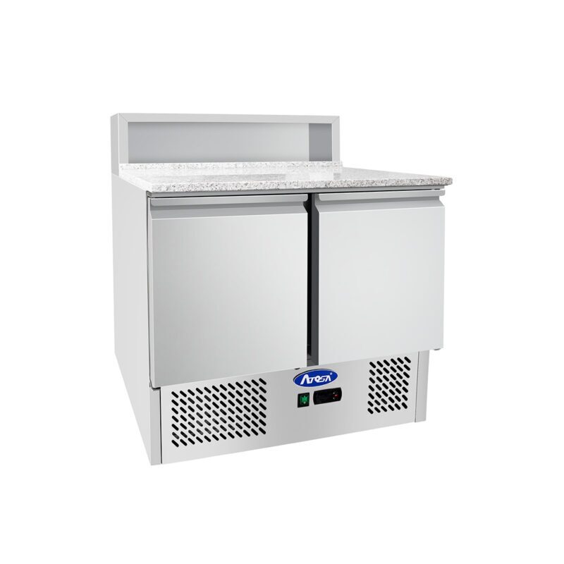 Banc pentru preparare pizza cu 2 usi, capacitate 300 Lt, structura inox, vitrina ingrediente inclusa, capacitate 5 cuve GN1/6, (nu sunt incluse), racire ventilata, structura inox si blat granit, control digital, temperatura -2°C/+8°C, gaz refrigerant R600a, garnituri magnetice ale usii, usa poate fi mentinuta deschisa la pozitia de 90 °.