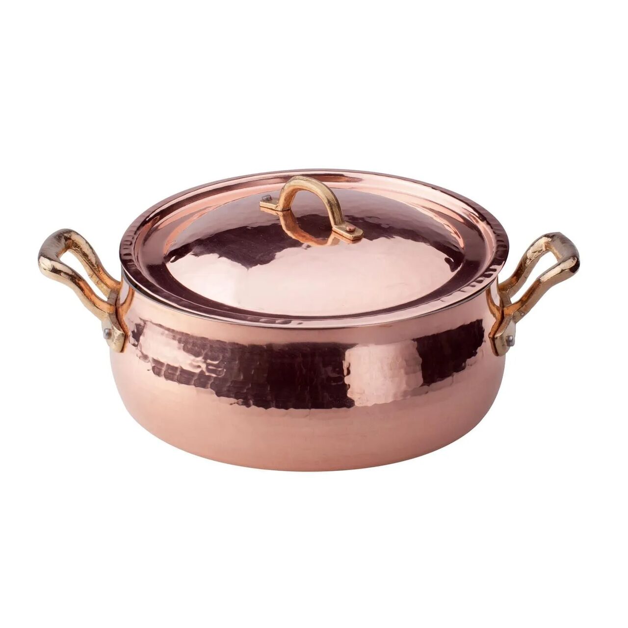 Cratița bombată Pentole Agnelli din cupru cu finisaj ciocănit manual de 2 mm este prevăzută cu două mânere din alamă, corp și capac din cupru cositorit ciocănit manual, având un aspect nobil și rafinat, fiind ideală pentru prăjire, înăbușire, fierbere și utilizată pentru preparate care nu necesită fierbere, în special pentru preparate din carne și legume, și servită la masă.