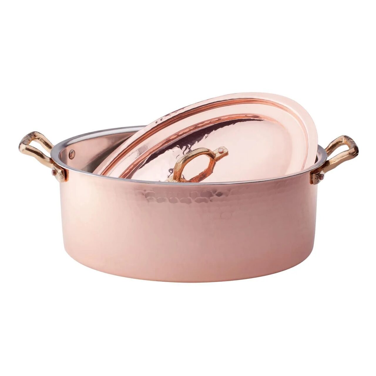 Cratița ovală Pentole Agnelli din cupru cu finisaj ciocănit manual de 2 mm este prevăzută cu două mânere din alamă, corp și capac din cupru cositorit ciocănit manual, având un aspect nobil și rafinat, fiind ideală pentru prăjire, înăbușire, fierbere și utilizată pentru preparate care nu necesită fierbere, în special pentru preparate din carne și legume, și servită la masă.