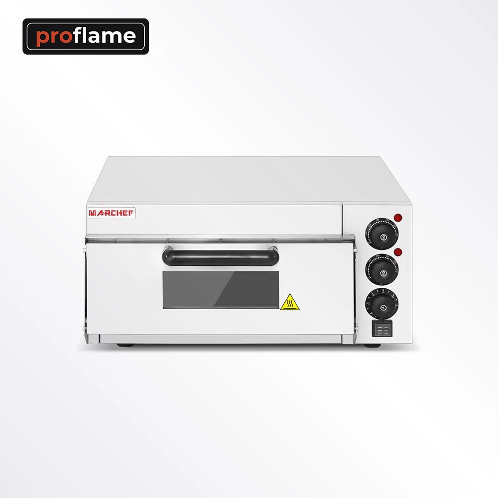 Cuptor pizza, structura inox, 1 camera de coacere (400x400x120 mm), interval temperatura 0 - 350℃, termostat + intrerupator de alimentare + temporizator, greutate neta 19 kg.