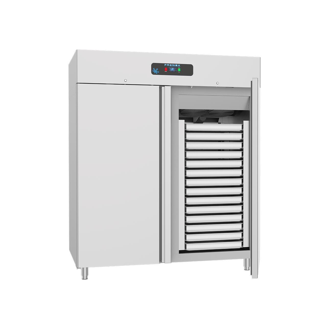 Dulap congelare vertical cu 2 usi pentru patiserie si capacitate de 1700 lt / 28 nivele suporti, capacitate 56 tavi 40x60 cm distanta intre tavi 8cm. Este un dulap congelator compact si util pentru toate locatiile care produc si vand produse de patiserie precum patiserii, supermarketuri, restaurante.
