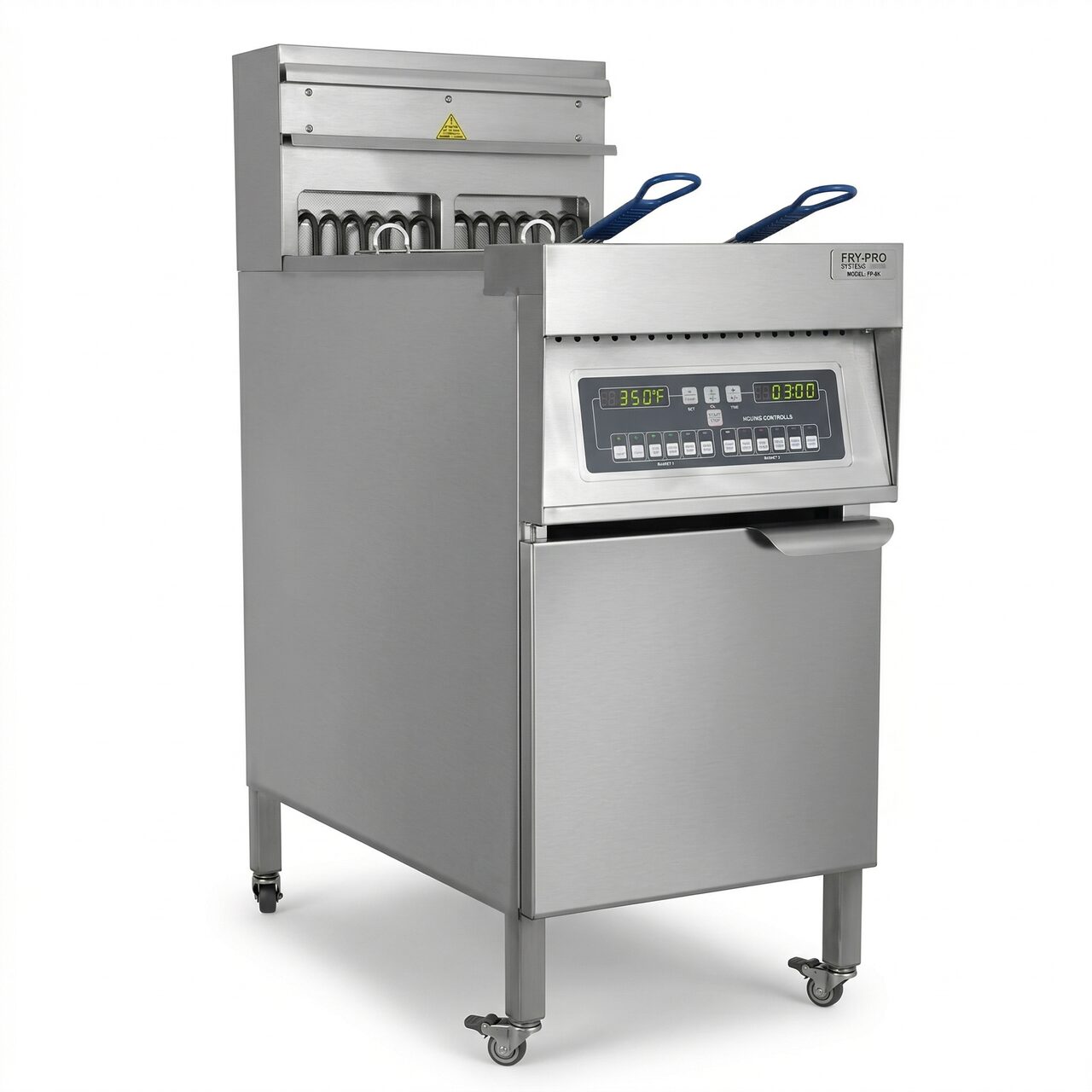 Friteusa electrica cu 1 cuva, structura inox, capacitate 24 Lt, dimensiuni interioare: 354x509x316h mm, dimensiune cos 2 x (322x150x142 mm), interval de temperatura 130-200℃, limitator de temperatura 240℃, 12 meniuri independente, panou de control digital computerizat, greutate neta 55 kg.