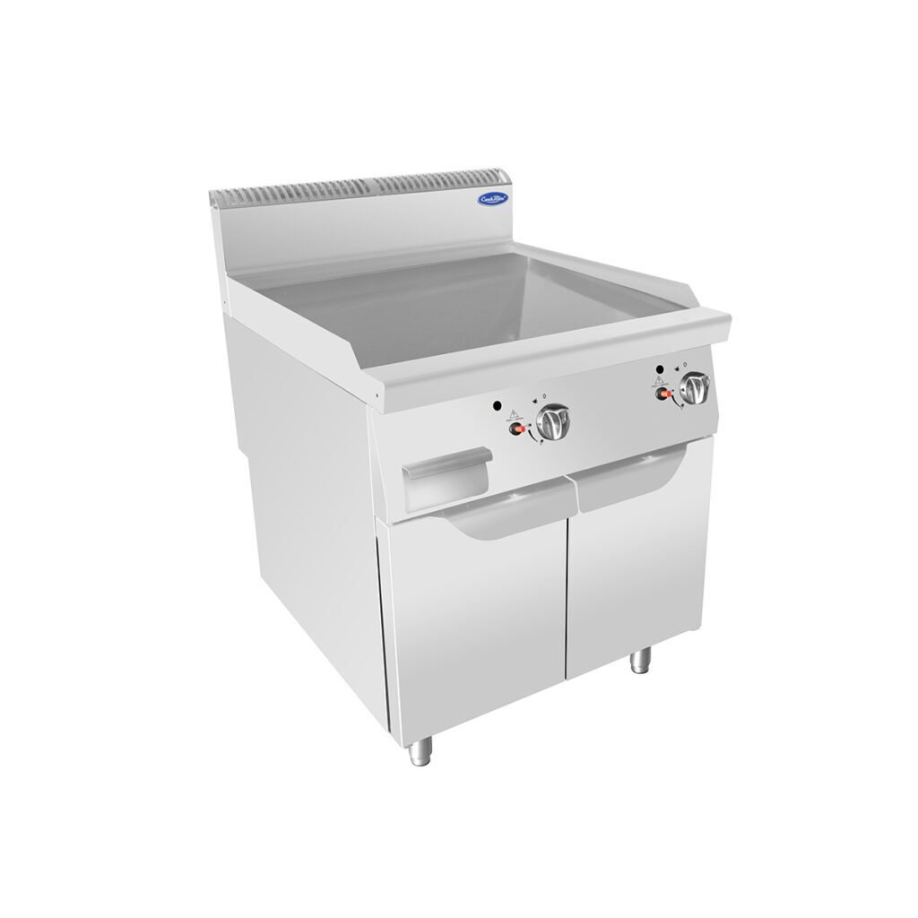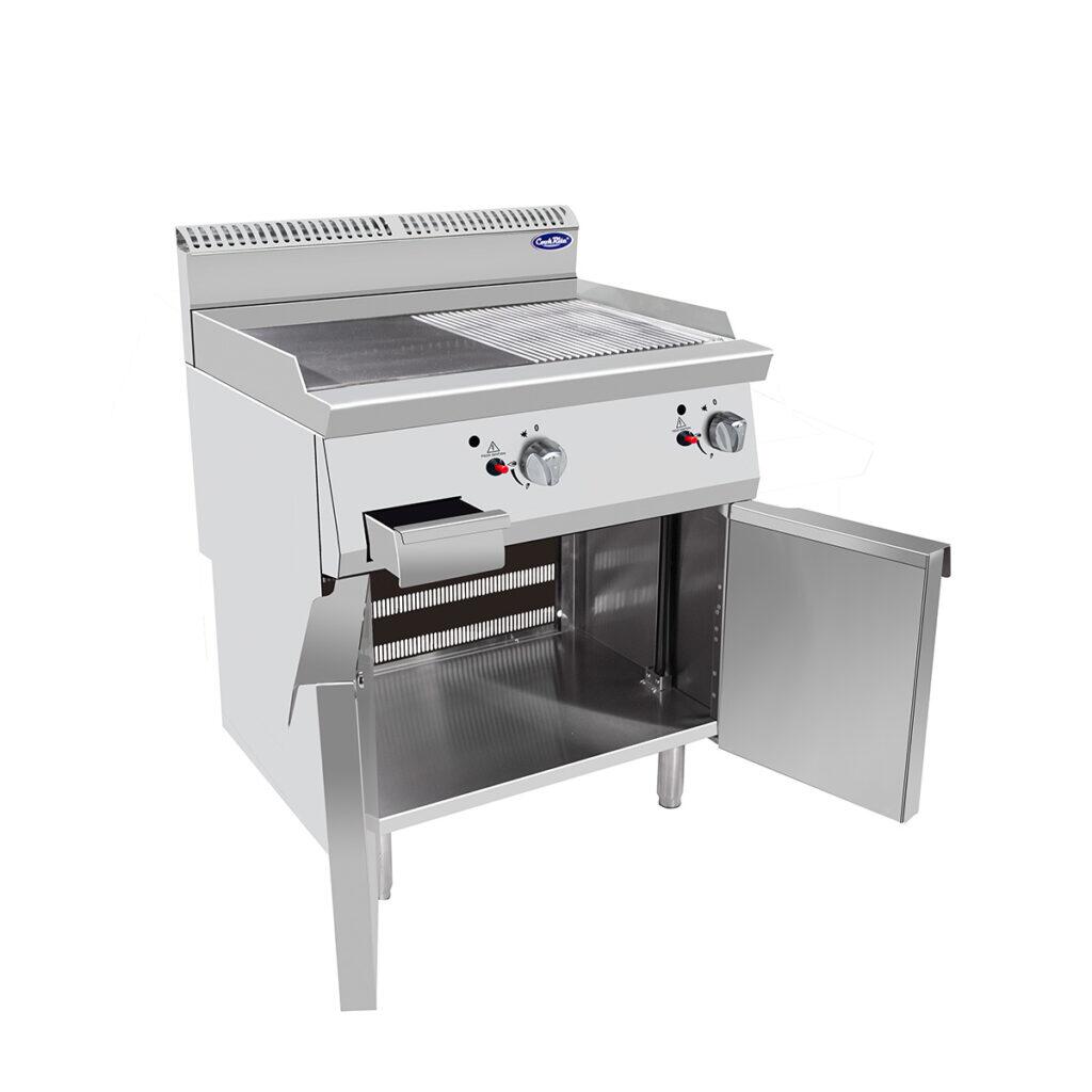Gratar cu placa neteda, suprafata de lucru: 796x694, structura inox, pe suport neutru inchis cu 2 usi, suprafata de gatit ajustabila in inaltime, sertar colectare grasimi, aprindere piezoelectrica, picioare reglabile pe inaltime, greutate 93 kg.