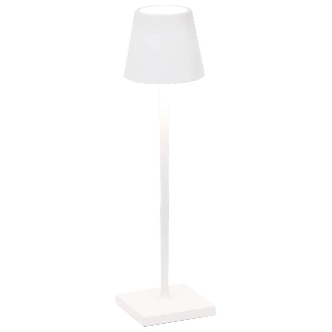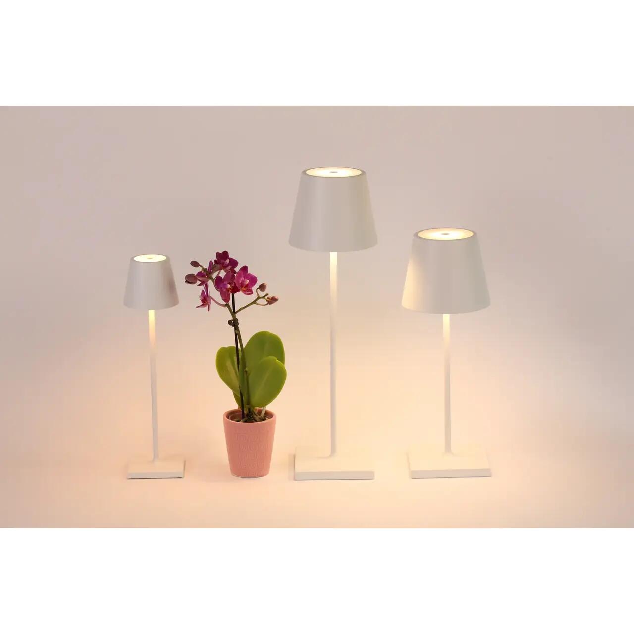 Lampa de masa reincarcabila, cu baza de incarcare prin contact, corp din aluminiu vopsit, difuzor din policarbonat si sursa de lumina LED.