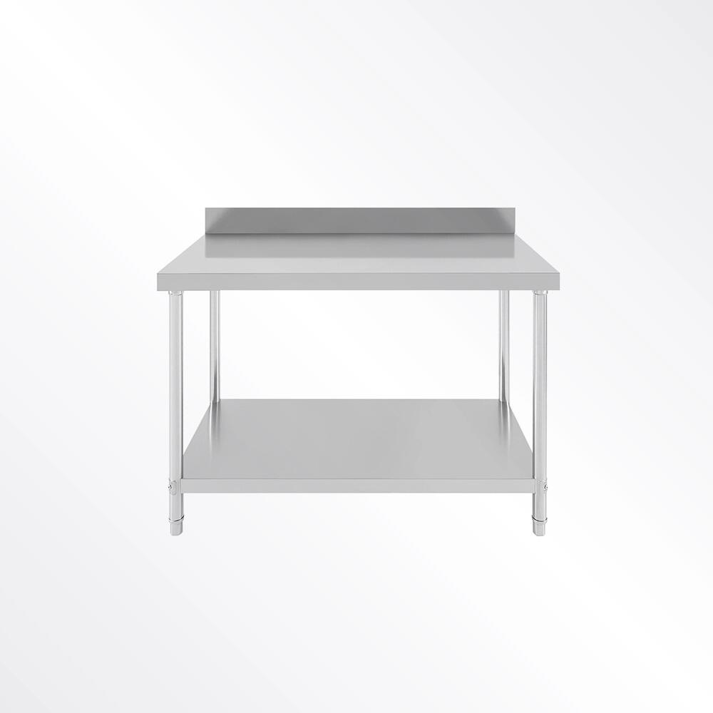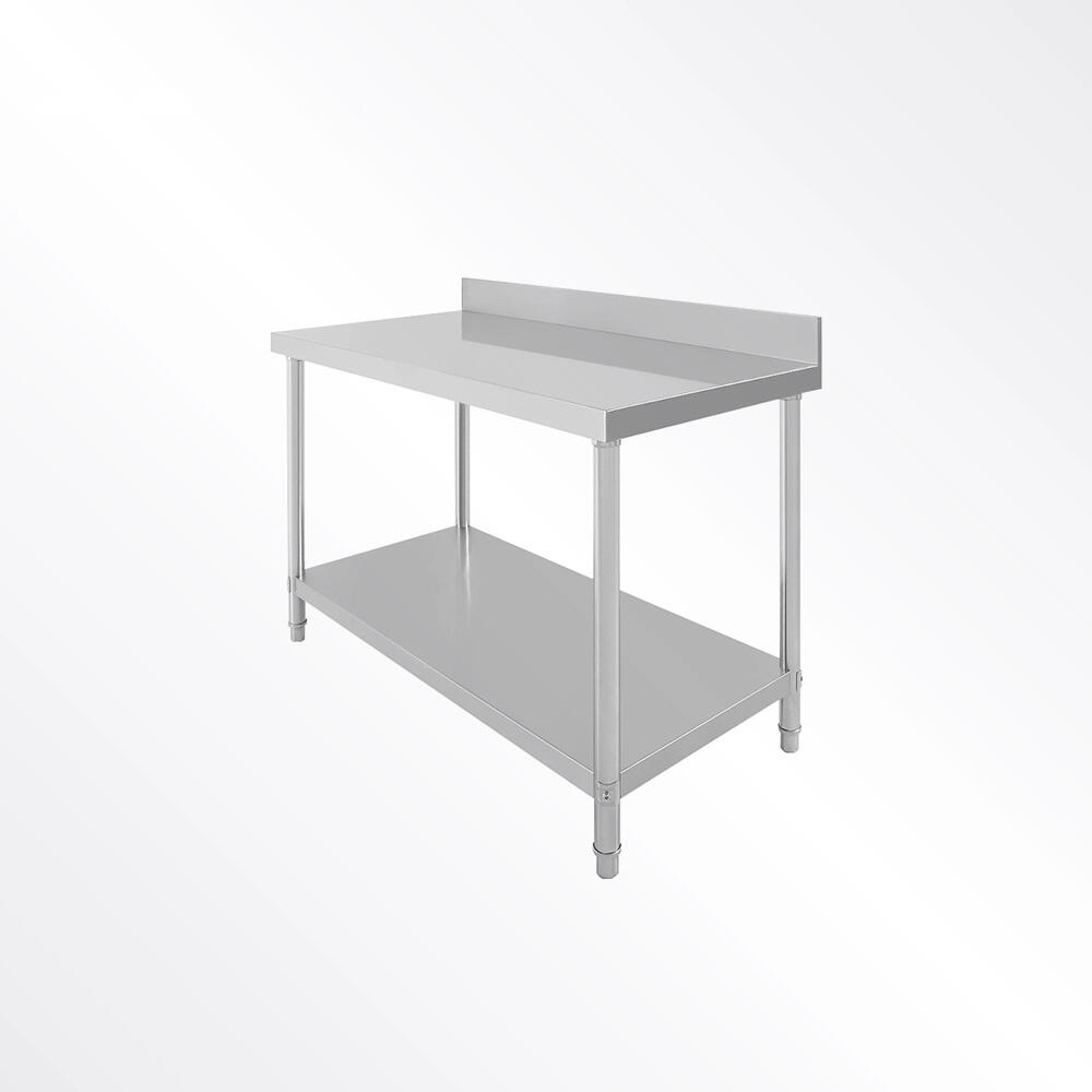Masa neutra, structura inox, pe suport neutru deschis, rebord la perete, cu polita inferioara, blat fono-absorbant rigidizat cu pal melaminat, picioare rectangulare reglabile pe inaltime.