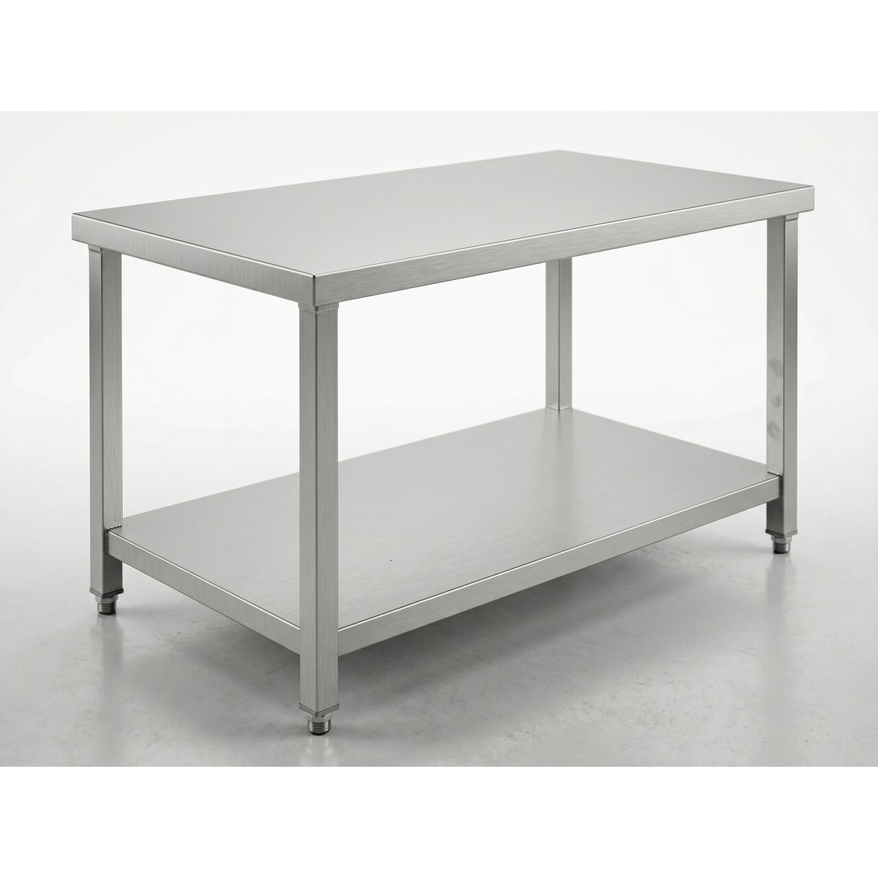 Masa neutra, structura inox, pe suport neutru deschis, cu polita inferioara, blat fono-absorbant rigidizat cu pal melaminat, picioare rectangulare reglabile pe inaltime.