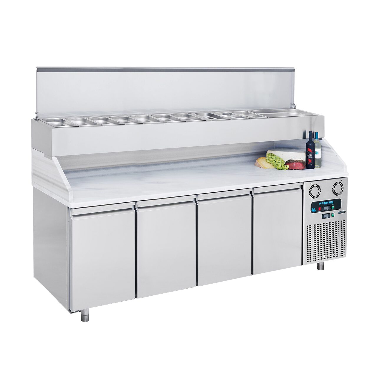 Masa rece preparare pizza dispune de termostat si termometru digital ce poate fii utilizat cu usurinta, structura, interior si exterior, din otel-inox ce aduce o nota de eleganta si igiena, picioare reglabile pe inaltime, prevazut cu 4 polite, izolatie ecologica din poliuretan injectat cu densitatea de 35/40 kg/mc si grosime 5 cm, sistem evaporare apa automat cu gaz cald, temperatura ambientala: +43 grade Celsius / 65% umiditate. Temperatura de lucru al echipamentului este reglabila pentru a fii eficient fiecarui ingredient.