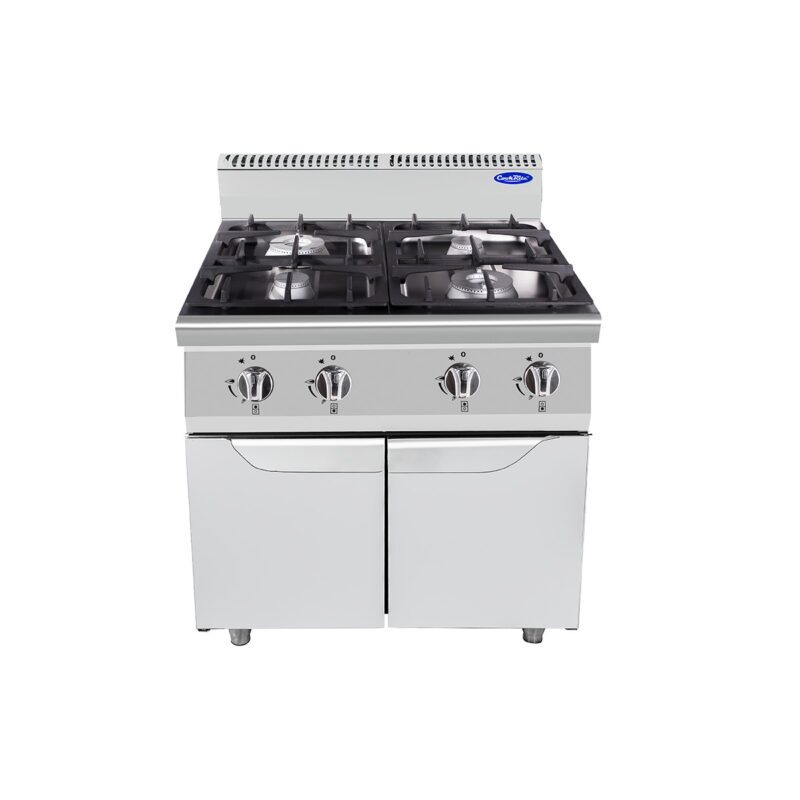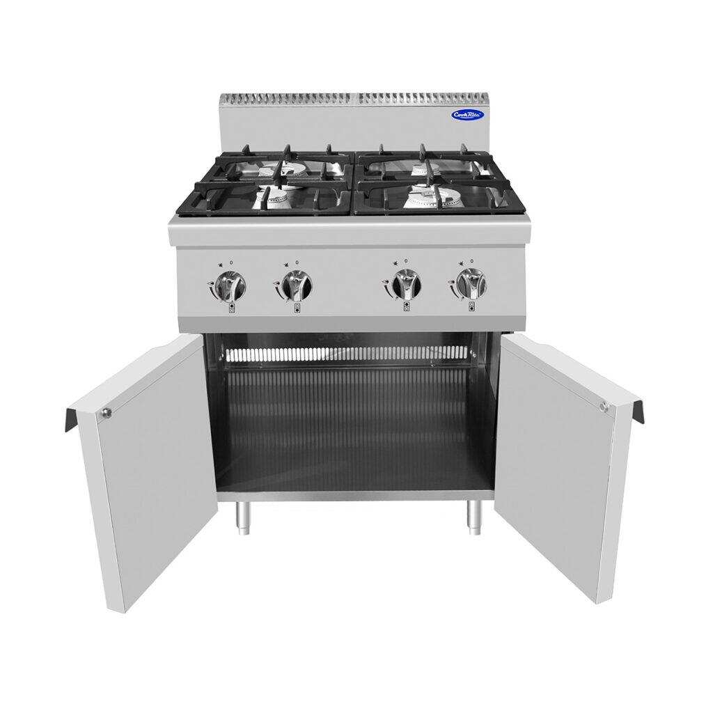 Masina de gatit cu 4 focuri, structura inox AISI 430, aratoare 2 x 3.5kW si 2 x 7kW, pe suport neutru inchis cu 2 usi, blat din otel inoxidabil AISI 304 cu grosimea de 1,5 mm, flacara pilot si sistem de siguranta impotriva opririi accidentale, aprindere piezoelectrica, gratarele detasabile din fonta faciliteaza curatarea zilnica, picioare reglabile in inaltime, greutate 90 kg.