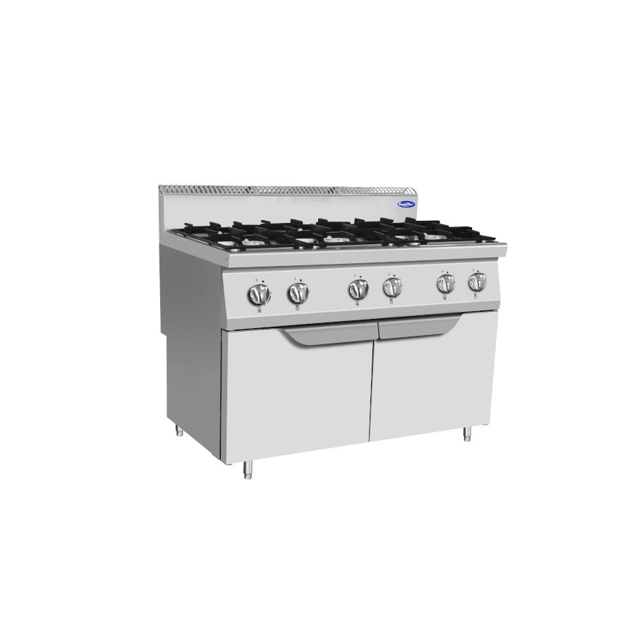 Masina de gatit cu 6 focuri, structura inox AISI 430, aratoare 1 x 3.5kW, 2 x 7kW si 3 x 10kW, pe suport neutru inchis cu 2 usi, blat din otel inoxidabil AISI 304 cu grosimea de 1,5 mm, flacara pilot si sistem de siguranta impotriva opririi accidentale, aprindere piezoelectrica, gratarele detasabile din fonta faciliteaza curatarea zilnica, picioare reglabile in inaltime.