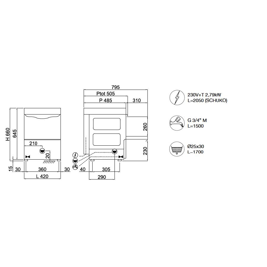 Dozatorul electric dublu standard de agent de clătire și detergent asigură o igienă maximă la fiecare ciclu de spălare cu mari economii, brațele de spălare și clătire turnate asigurand fiabilitate și durabilitate. Caroseria este realizată în întregime din oțel AISI 304 și a fost proiectată cu toate componentele din față pentru asistență tehnică ușoară. Este o masina de spălat vase robusta și de încredere care face față foarte bine in fiecare moment al zilei.