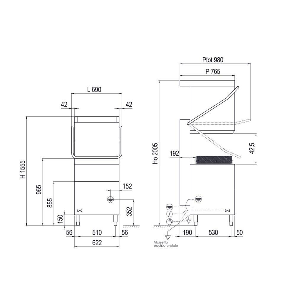 Mașina de spălat vase cu capota ELS60TH este soluția potrivită pentru unitățile care trebuie să spele diferite tipuri de vase, dovedindu-se capabilă să spele pahare, vase, obiecte de dimensiuni medii de până la 500x500x390(h)mm și tăvi gastronorm GN 1/1 într-un singur loc. 620 mm latime, asigurand o productivitate maxima de 60 cosuri/ora (1080 vase/ora). Mașina de spălat vase este echipată și cu un dedurizator automat pentru apă care previne formarea de calcar cu o eficiență extremă. De fapt, dedurizatorul de apă este complet autonom și își controlează automat intervalele de regenerare în funcție de duritatea apei de intrare; tot ce trebuie să faceți este să umpleți rezervorul de sare ori de câte ori pe afișaj apare mesajul „fără sare”. Panoul său de control practic situat la nivelul operatorului este vizibil și ușor de controlat, mai ales în instalațiile de colț. Modelele de tip hotă sunt echipate cu un suport de coș ușor demontabil pentru o curățare ușoară și un rezervor turnat rotunjit, cu filtre integrate, pentru o scurgere perfectă și o igienă absolută. Sistemul de pornire a ciclului „PUSH TO START” asigură un consum mai mic de energie pastrand aburul in camera de spalare si împiedicând începerea spălărilor goale.