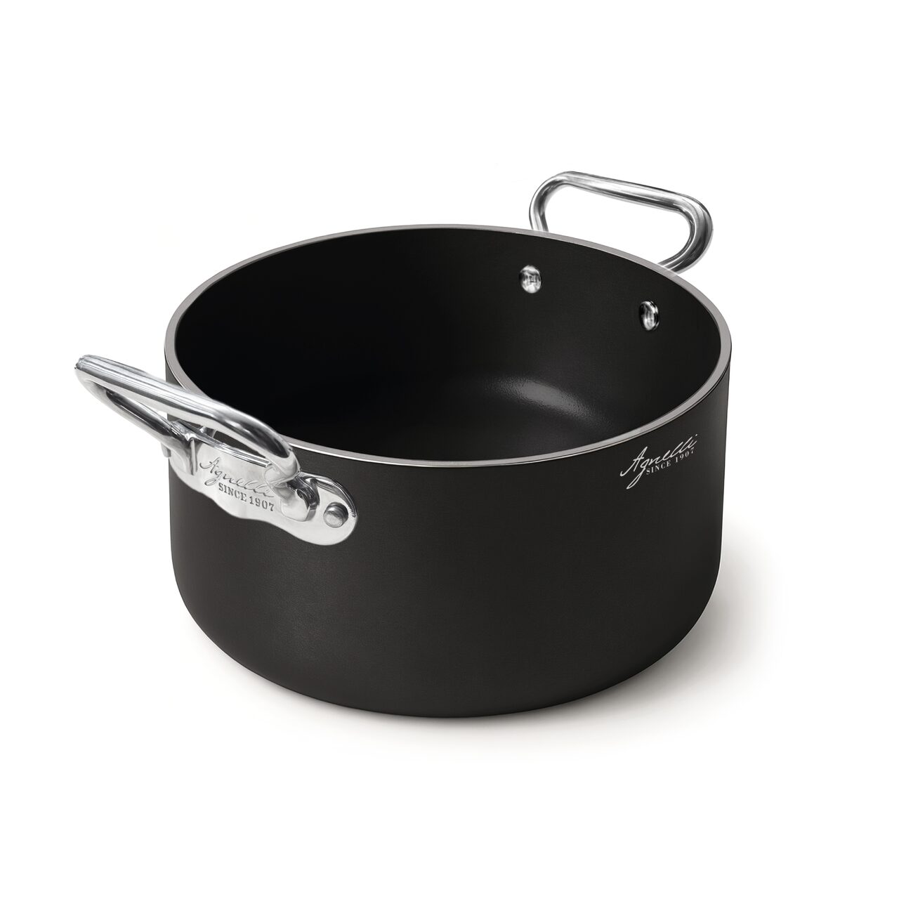 Oala din aluminiu de 5 mm antiaderent pentru inducție din linia Pentole Agnelli 1907 AlBlack este compusă din două mânere din oțel inoxidabil fără nichel și un corp din aluminiu antiaderent și este ideală pentru fiert, copt, prăjit, gratinat, tocat, prepararea sosurilor și cremelor, extragerea fondurilor și amestecarea compușilor.