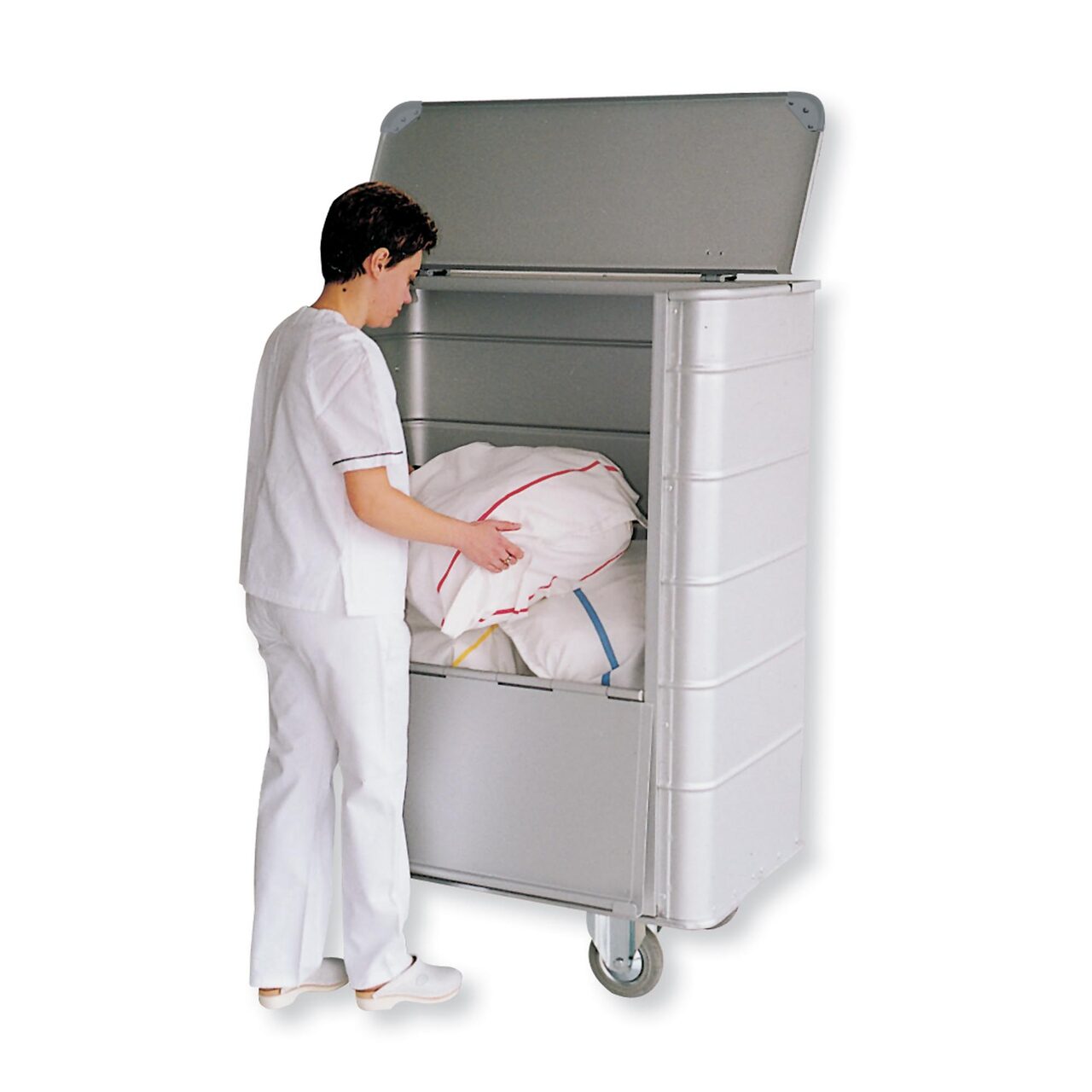 Capac împărțit în două părți: 1/3 fixat 2/3 în poziție deschisă până la 130 ° cu balamale din nailon și oțel inoxidabil. Un mâner de împingere pe o parte scurtă. Robinet de scurgere. Cadru din aliaj ușor inferior. În jurul tamponului din aliaj ușor. 2 roti fixe și 2 rotative rotative dia. 160 mm cu inel de cauciuc nemarcabil și carcase zincate.