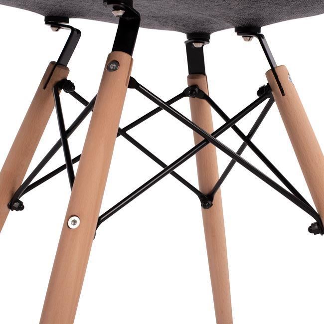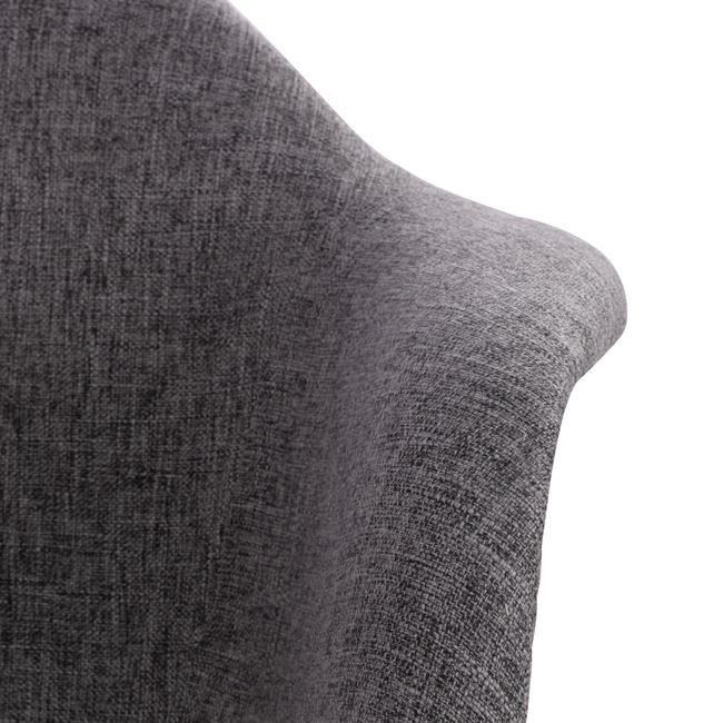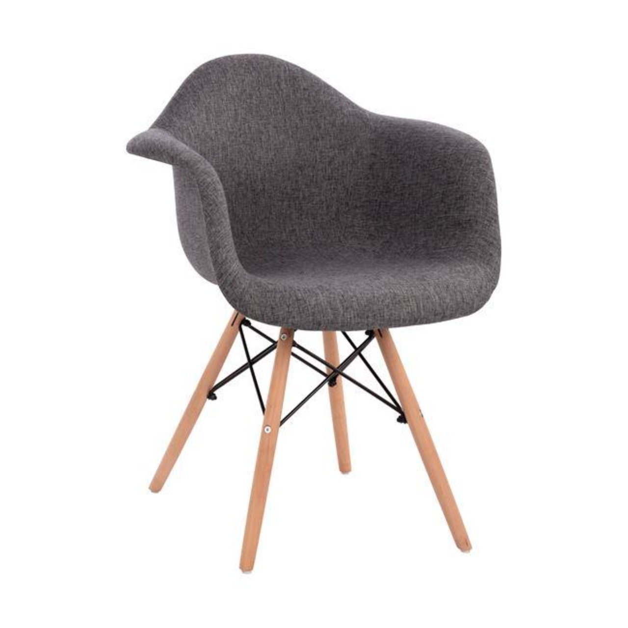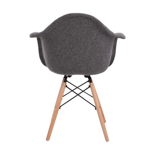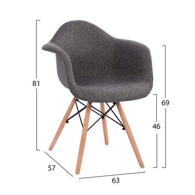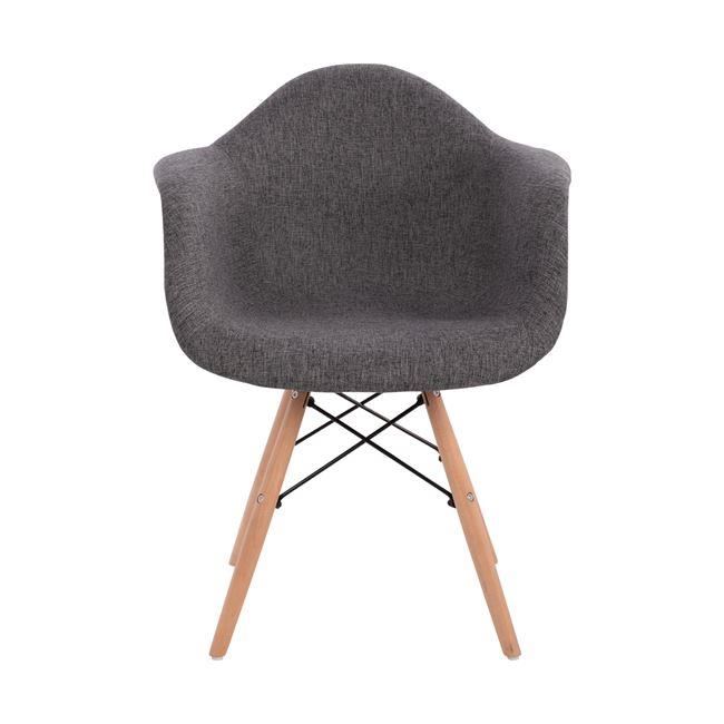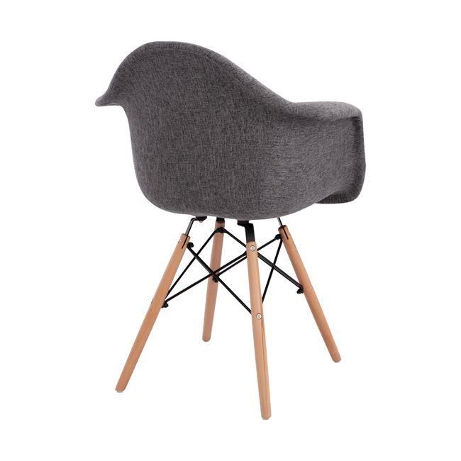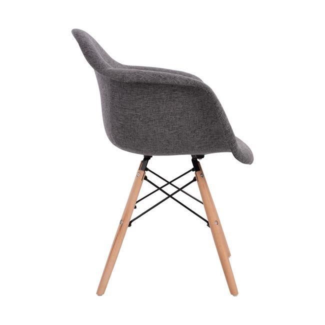 Scaun cu o combinatie de tesaturi de culoare gri cu manere. Picioarele scaunului sunt din lemn.