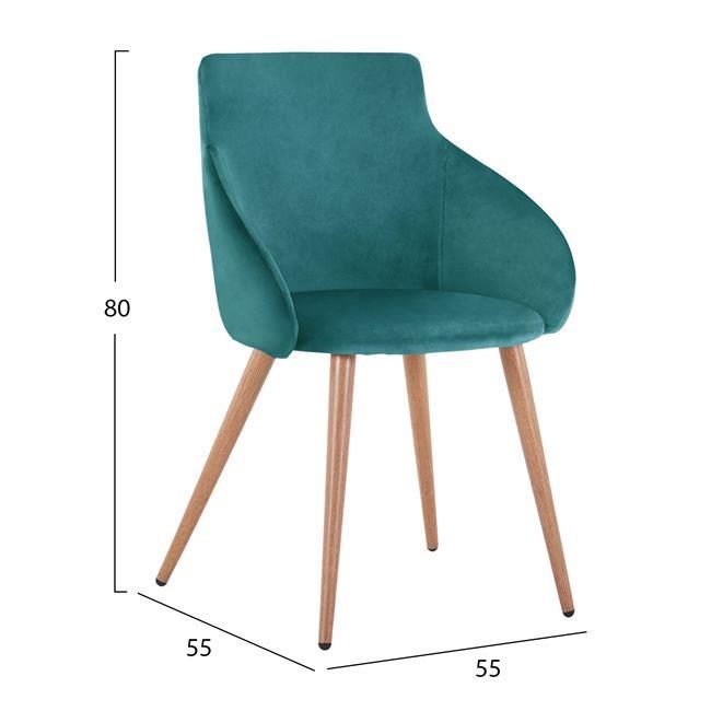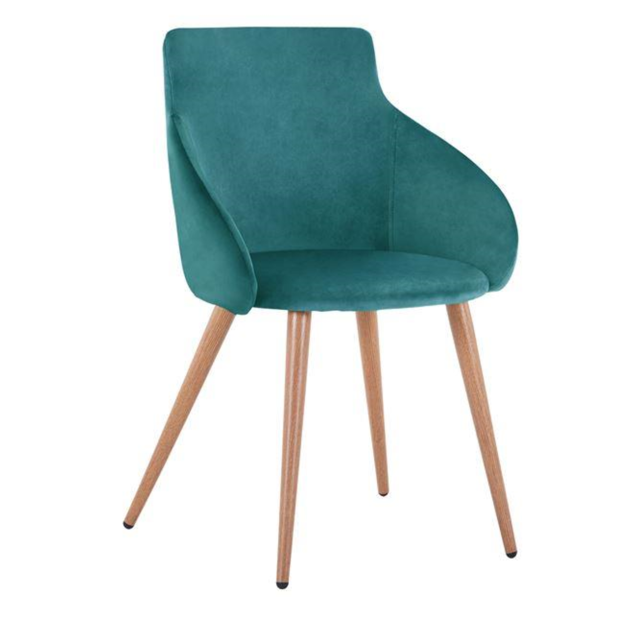 Scaun de catifea verde cu manere. Picioarele scaunului sunt metalice si vopsite in culoarea lemnului.