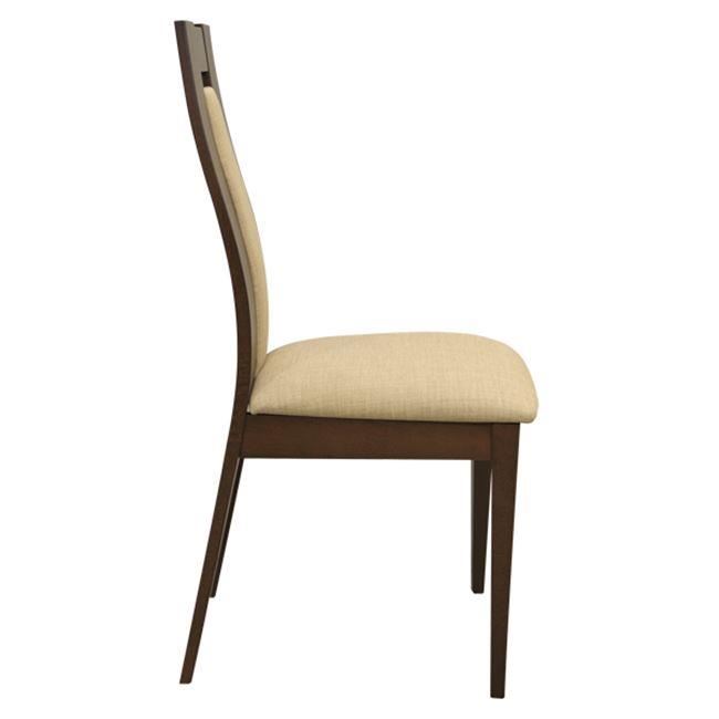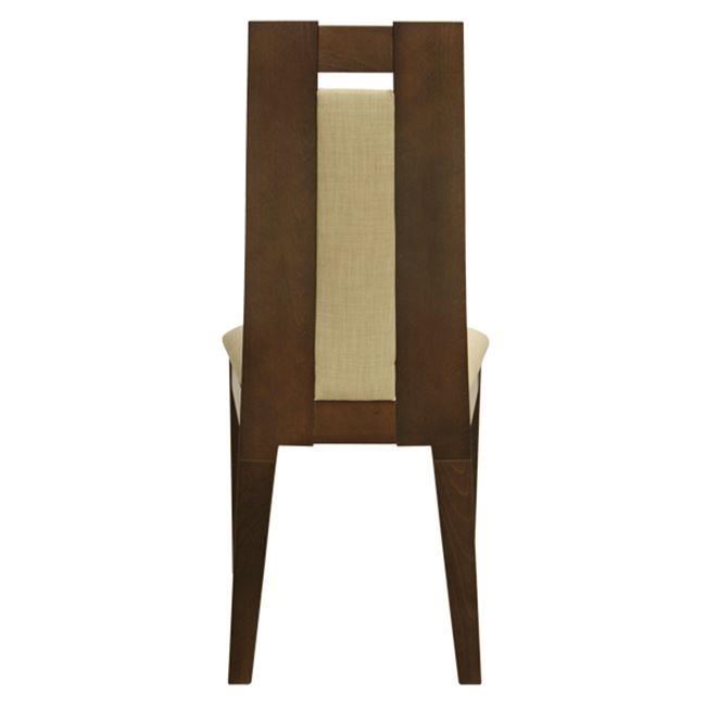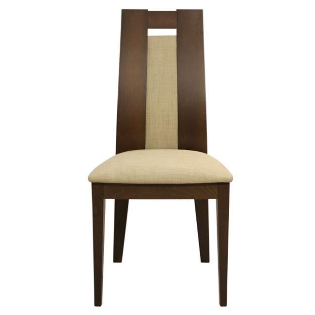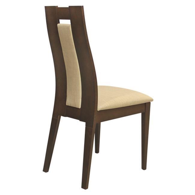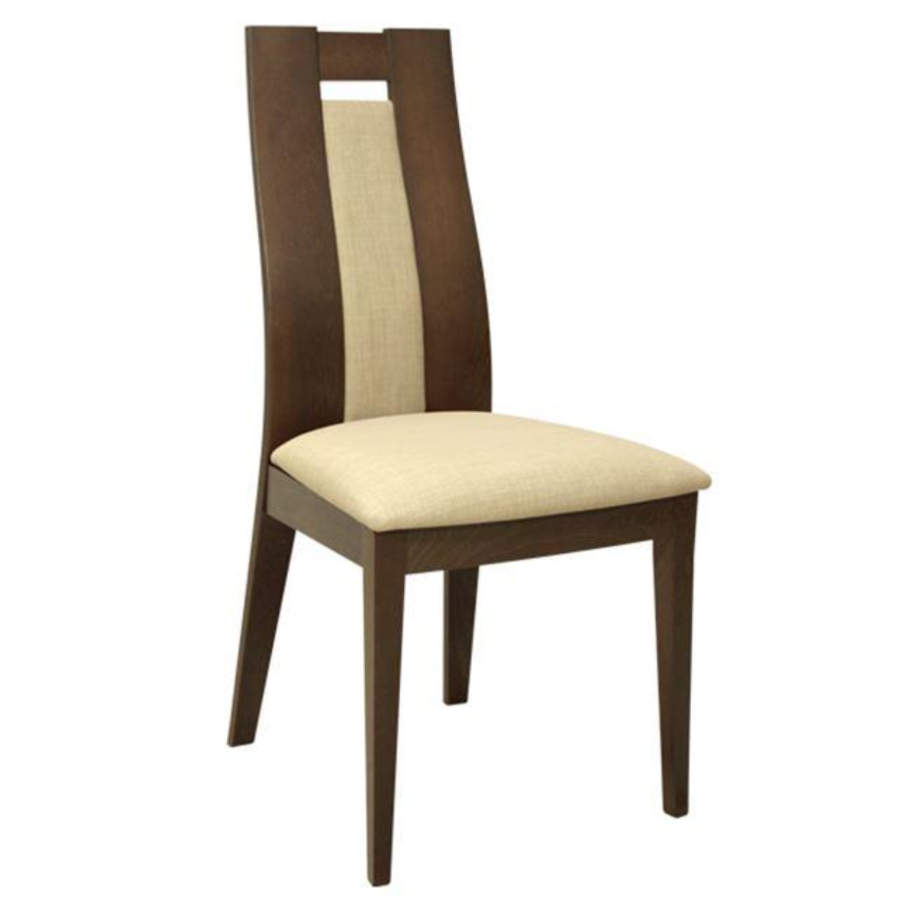 Scaun din lemn masiv (nuc) in culoare naturala, cu tesatura pe sezut si pe mijlocul spatarului de culoare crem.