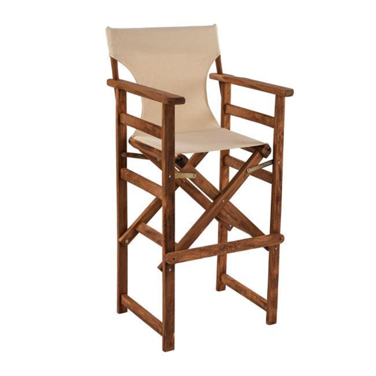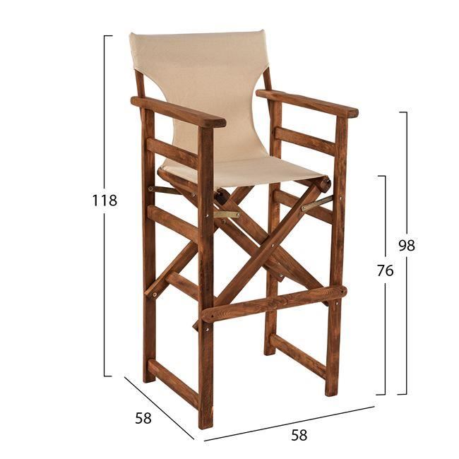 Scaun din lemn pentru bar Limnos, pliabil, cu panza pe spatar si sezut. Construit din lemn masiv in culoarea nucului cu panza de culoare crem.