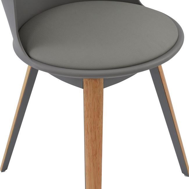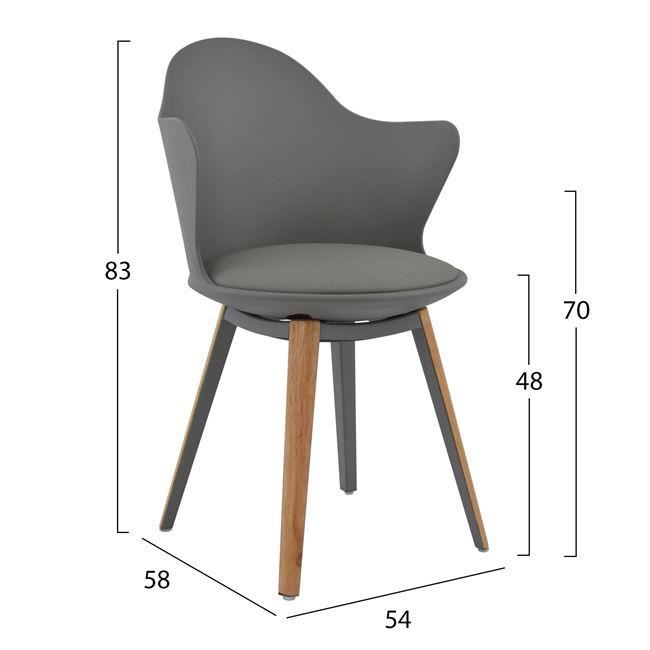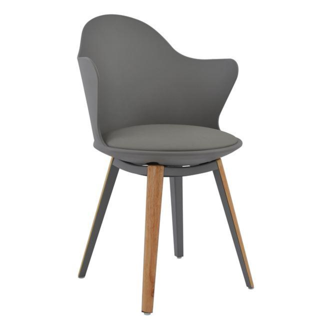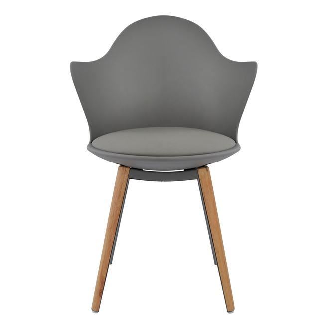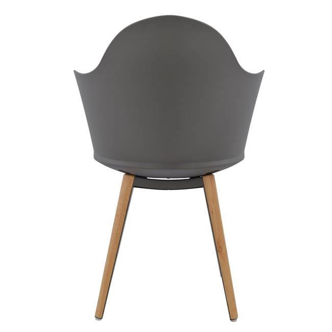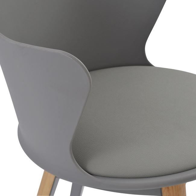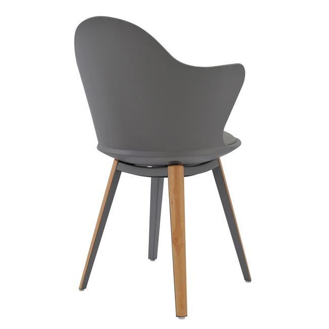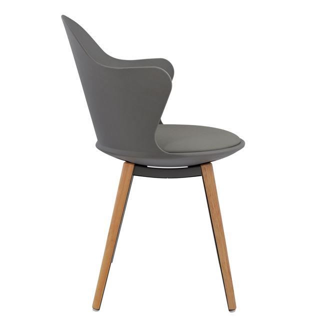 Scaun modern din polipropilena, cu o pernă PU la scaun și picioare din construcție metalică în interior în culoare neagră și spre exterior este acoperit cu lemn.