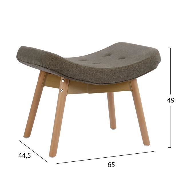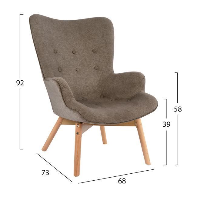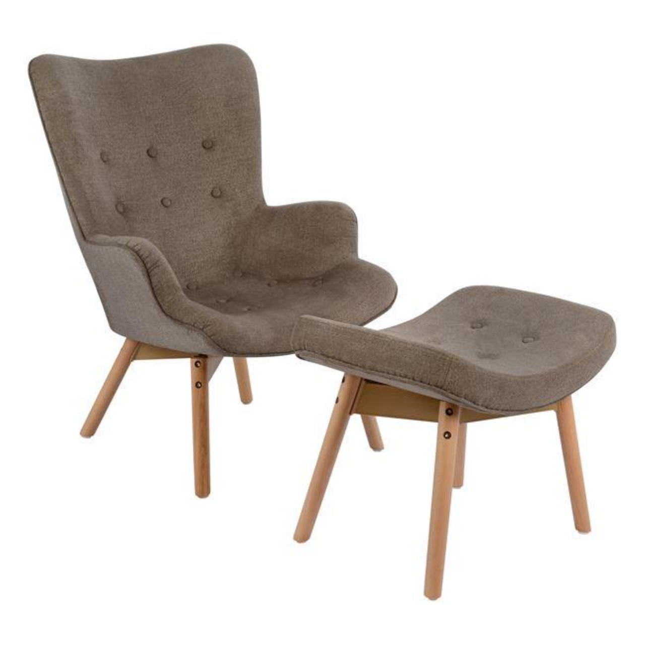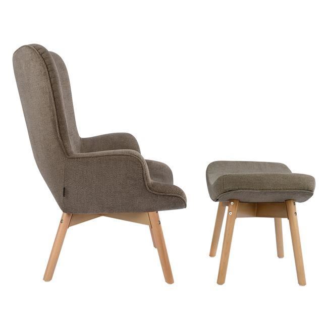 Set fotoliu cu taburet Rustica, cadru din lemn acoperit cu tesatura de inalta calitate de culoare maro.