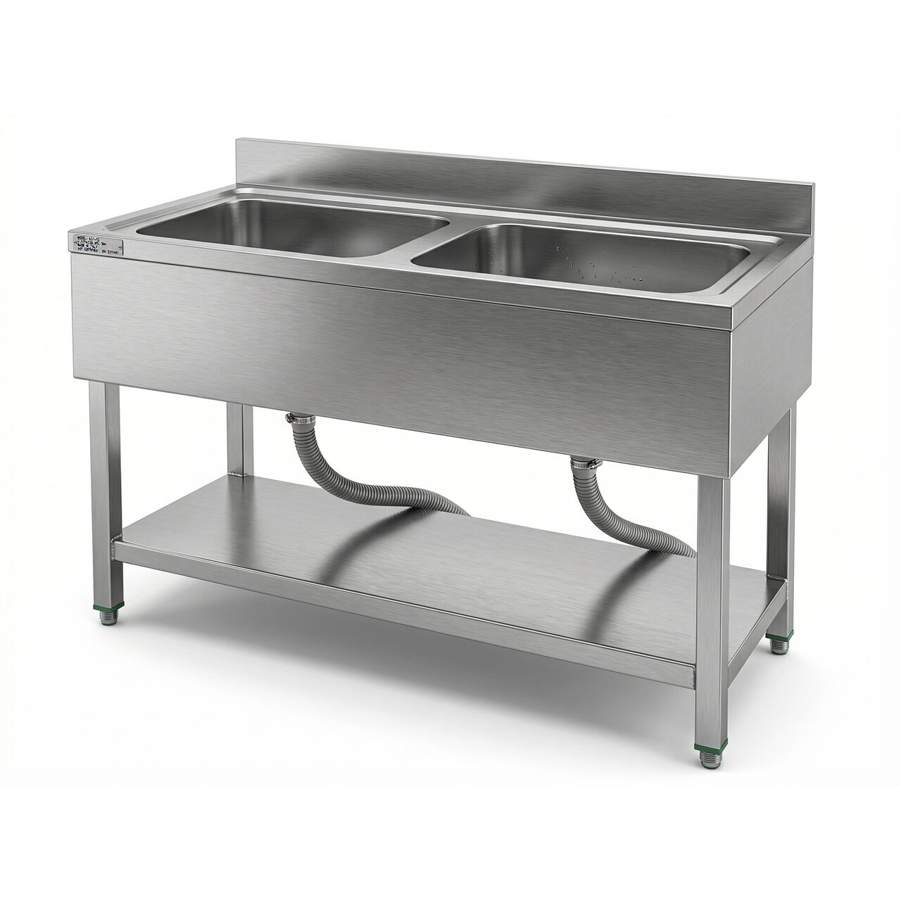 Spalator cu 2 cuve, dimensiuni cuve: 2x (400x400x350h), cuve fono-absorbante, structura inox, rebord la perete si polita inferioara, blat fono-absorbant rigidizat cu pal melaminat, diametrul orificiului pentru baterie este de Ø 33 mm, diametrul orificiului de scurgere este de Ø 52 mm, picioare cu teava rectangulara.