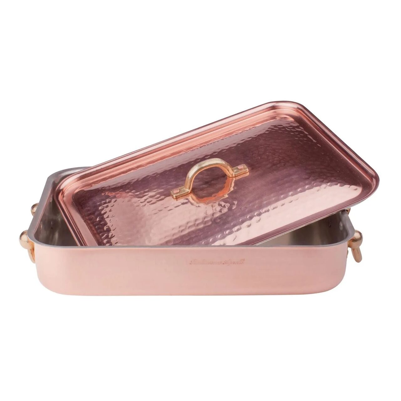 Tava dreptunghiulară din cupru pentru friptură, cu finisaj ciocănit si grosimea de 2 mm, de la Pentole Agnelli, este alcătuit din două mânere din alamă îmbinate, un corp și un capac din cupru cositorit manual, cu un aspect nobil și rafinat. Grătarul îl face potrivit pentru gătitul ușor la abur și este ideal pentru fierbere, înăbușire și coacere.
