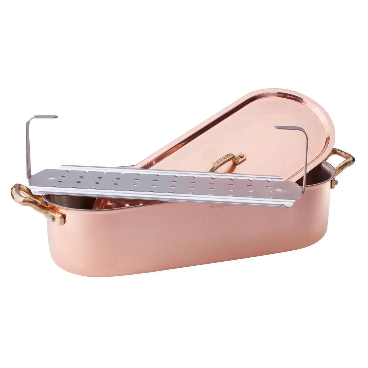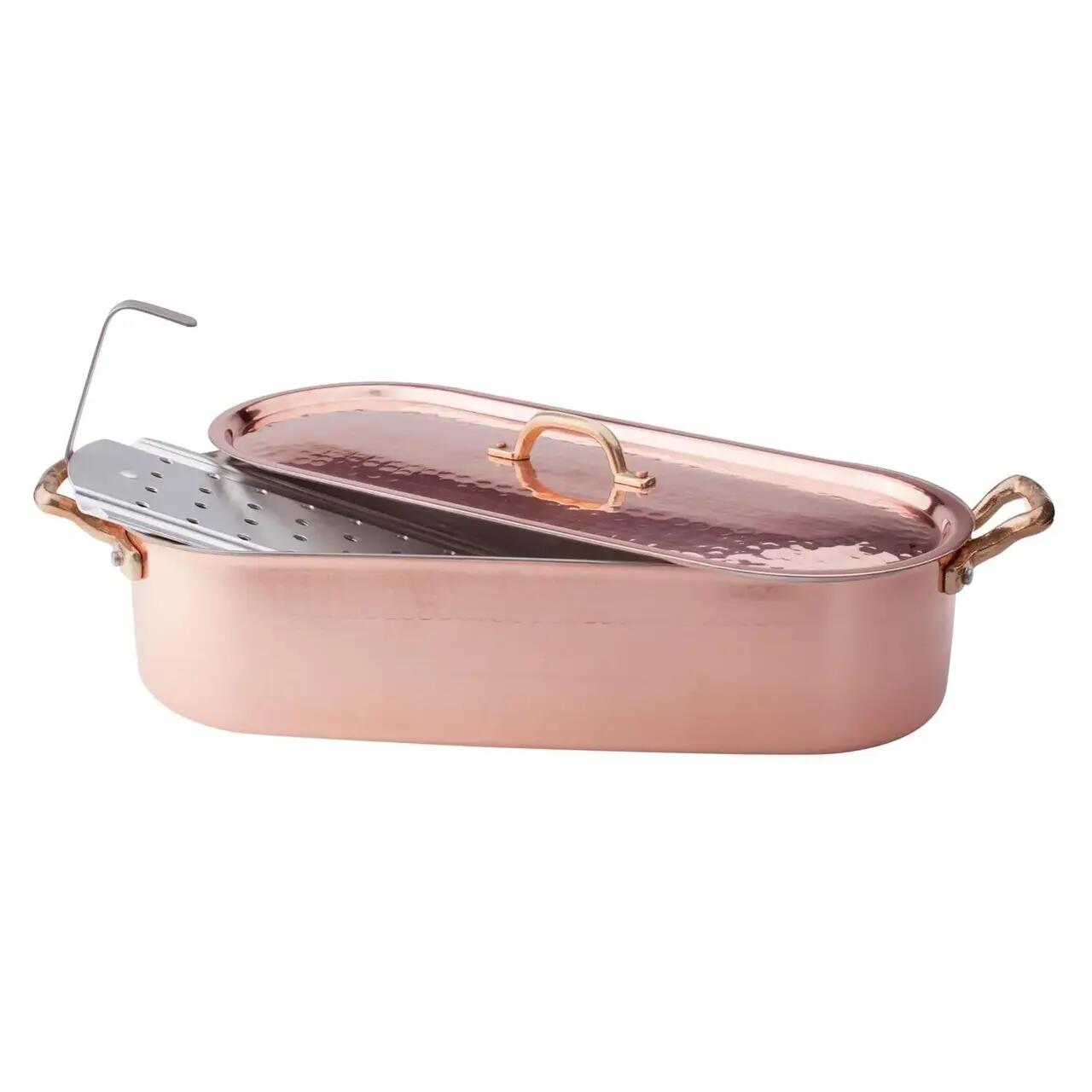 Tava pentru pește din cupru cositorit, ciocănit manual, cu grosimea de 2 mm, de la Pentole Agnelli, este alcătuit din două mânere din alamă îmbinate, un corp și un capac din cupru cositorit manual, cu un aspect nobil și rafinat. Grătarul îl face potrivit pentru gătitul ușor la abur și este ideal pentru fierbere, înăbușire și coacere.