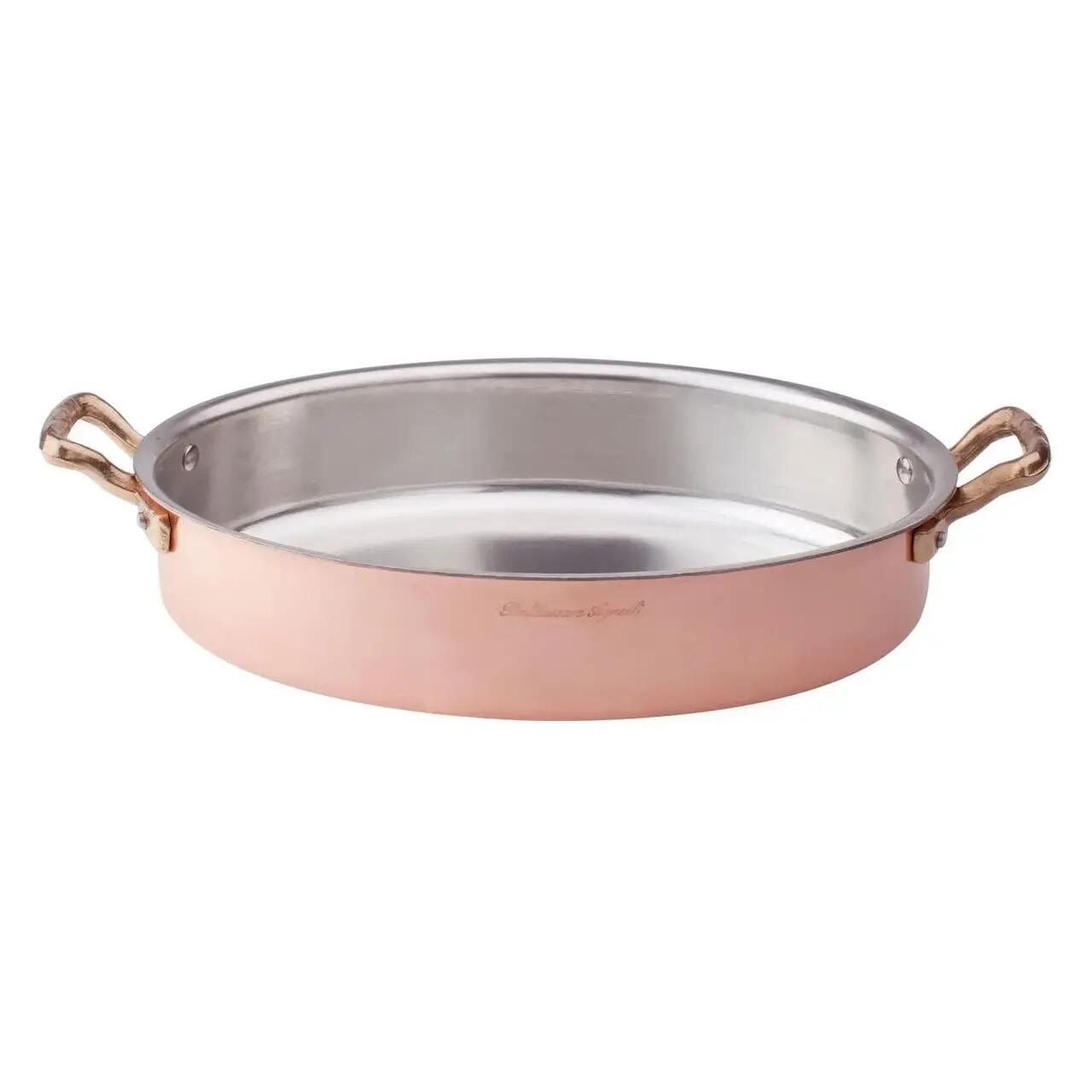 Tigaia ovală Pentole Agnelli din cupru cositorit ciocănit manual de 2 mm este prevăzută cu două mânere din alamă, corp și capac din cupru cositorit ciocănit manual, având un aspect nobil și rafinat, fiind ideală pentru prăjire, înăbușire, fierbere și utilizată pentru prepararea mâncărurilor care nu necesită fierbere, în special pentru preparate din carne și legume, servite la masă.