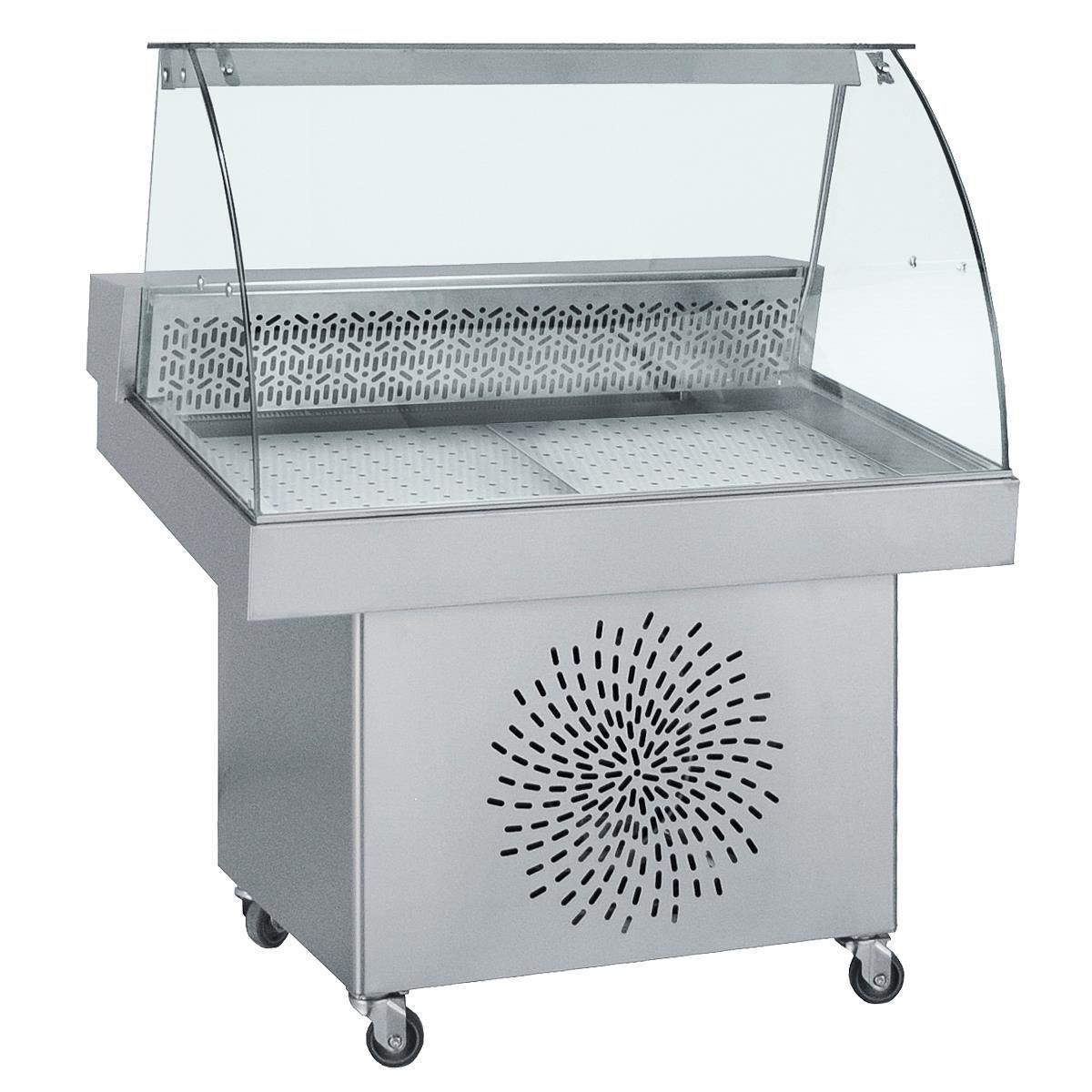 Vitrina de prezentare peste, cu blat inclinat cu drenaj, structura inox AISI 304, temperatura de lucru +2 / +10 °C, iluminare LED, racire statica, decongelare automata, control digital, gaz refrigerant R290, freon ecologic, abilitatea de a pastra pestele si fructele de mare cu gheata, 4 roti multidirectionale, 2 cu frana.
